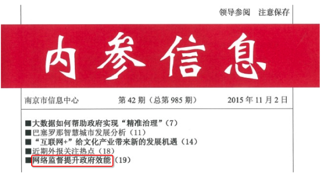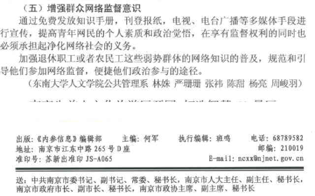 公共管理系13级本科生林姝、严珊珊、张祎、陈甜、杨亮、周峻羽等六位同学组成的暑期社会实践小组,于15-16学年短学期开展了“互联网+与网络监督提升政府效能作用研究”的调查,期间走访了南京市人民接待来访中心、南京市信访局网络信访办等单位,对如何利用网络监督提升政府效能提出了相关对策建议。实践小组撰写的调研报告《网络监督提升政府效能》作为封面文章发表于南京市信息协会会刊《南京信息》2015年第77期,其核心政策建议部分 收录于《内参消息》2015年第42期,报送南京市委书记、市长等主要领导审阅。(林姝、杨煜)