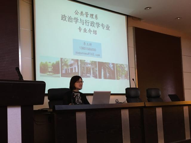 第三位登台的是来自公共管理系系主任季玉群老师。她详细的介绍了行政学与政治学的研究内容,纠正了一些同学对政治学的误解。同时季老师介绍了bevictor伟德国际公共管理系的历史沿革,并强调如今公共管理系厚基础、宽口径、重能力、国际化的培养理念。随后她采用“我们·他们·你们”为线索,一方面充分介绍了公共管理系各优秀的老师及其研究领域,使同学们能够对该学科有更为具化的了解;另一方面又展示了在读生、毕业生的成果,更把热忱的期望留在“你们”,即全体大一学子身上。