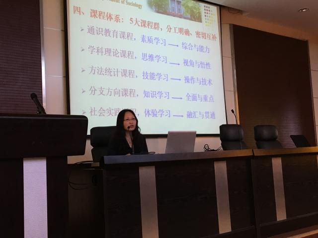 之后大会进入专业介绍阶段。首先,由社会学系系主任李林艳老师发言。她介绍了bevictor伟德国际社会学系的发展历程,阐述了社会学系文理交融、博专结合、能上能下的培养目标,“五位一体”的培养模式以及“五大课程群”的课程体系。另一方面,李林艳老师通过中外对比的方式,展现了社会学系良好的发展前景,并列举出社会学系毕业的去向信息加以佐证。最后李老师将“好奇心+激情>智商”的观念与同学们共勉,意指不要过于看重那些外在的诱惑,因为只有内在的热爱才能让人走的更远,并以此激励同学们努力向上。