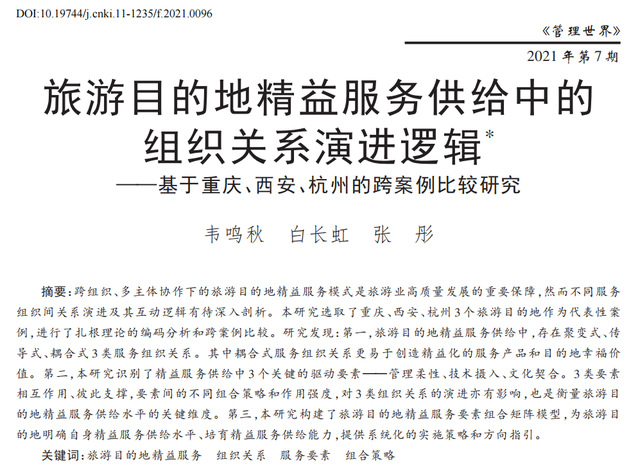 韦鸣秋老师发表于《管理世界》的《旅游目的地精益服务供给中的组织关系演进逻辑——基于重庆、西安、杭州的跨案例比较研究》一文,以国内旅游目的地为研究对象,通过对案例地不同服务组织关系演进逻辑、服务要素组合策略,探索旅游目的地高质量服务供给规律。该文打破已有研究囿于旅游公共服务或商业服务单一视角下组织关系研究的局限,开辟了对旅游目的地精益服务供给中“政府-企业-居民-游客”多元关系及互动逻辑的新认识。